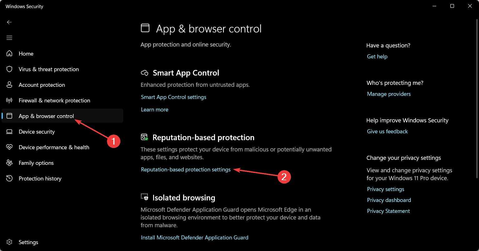 - Перейдите в раздел Проверка приложений и браузера и нажмите Параметры защиты на основе репутации.