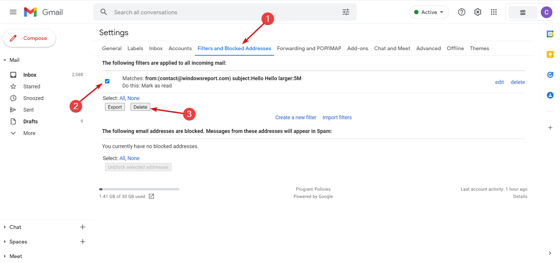 Alt: Вкладка Фильтры и заблокированные адреса в настройках Gmail