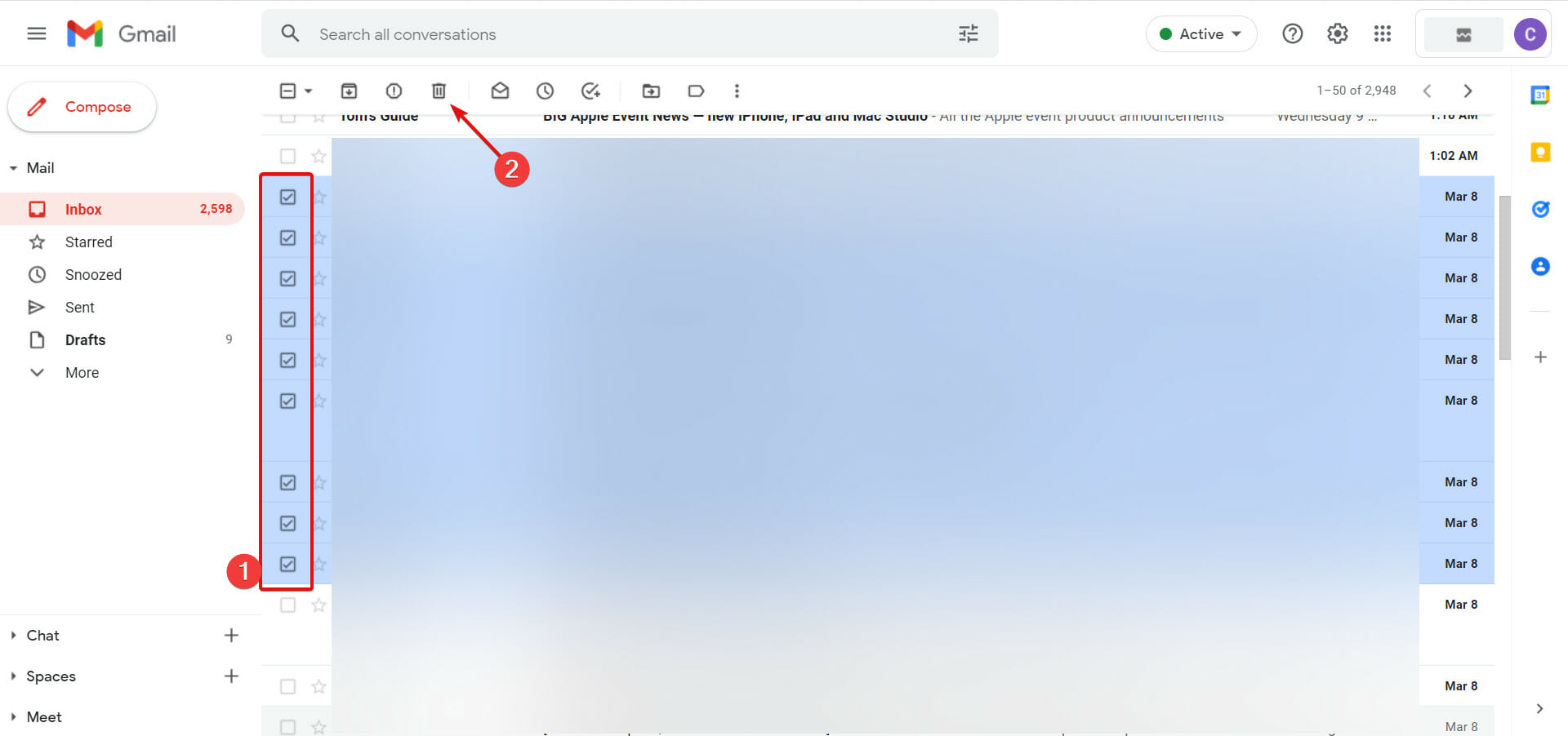Alt: Интерфейс Gmail с выделенными письмами для удаления