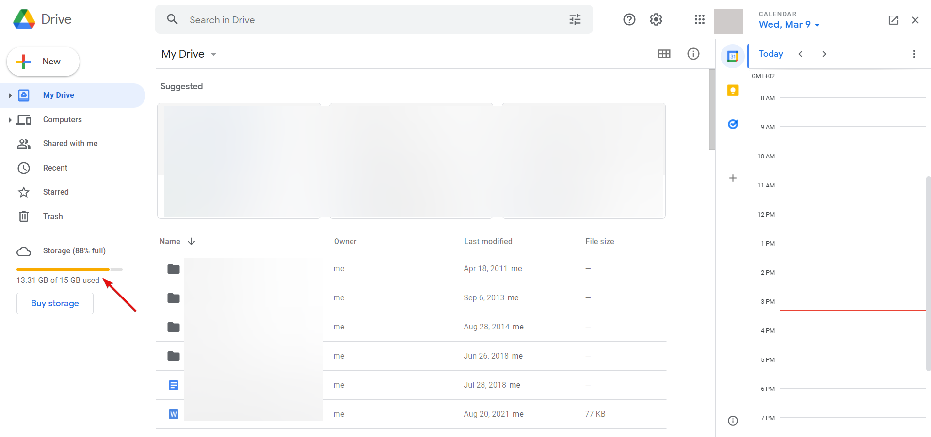 - Откройте Google Диск и посмотрите используемый объём внизу слева.