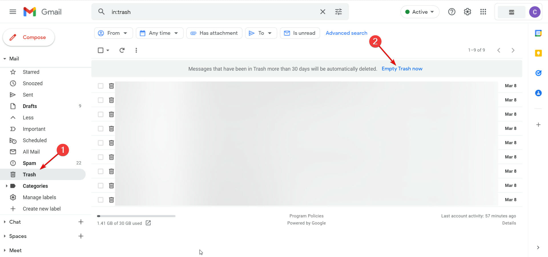 - Если пространство закончилось, удалите лишние письма в Gmail и очистите папку Корзина.