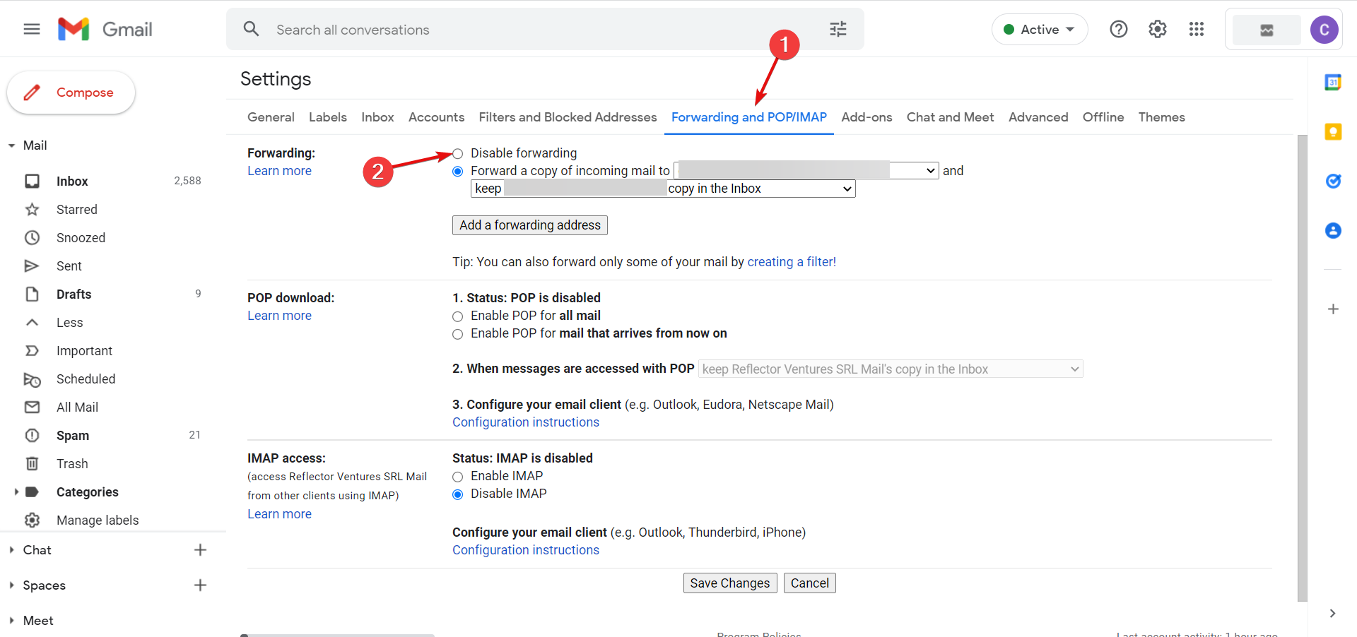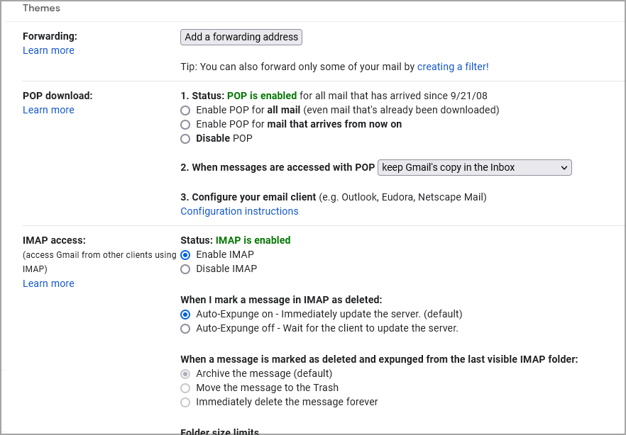Alt: Раздел Пересылка и POP/IMAP в настройках Gmail