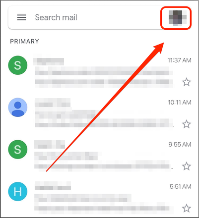 Alt: Нажатие на аватар в приложении Gmail для управления аккаунтами