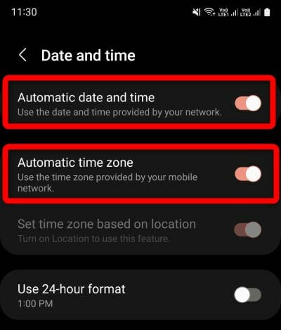 - Включите «Автоматическая дата и время» и «Автоматический часовой пояс».