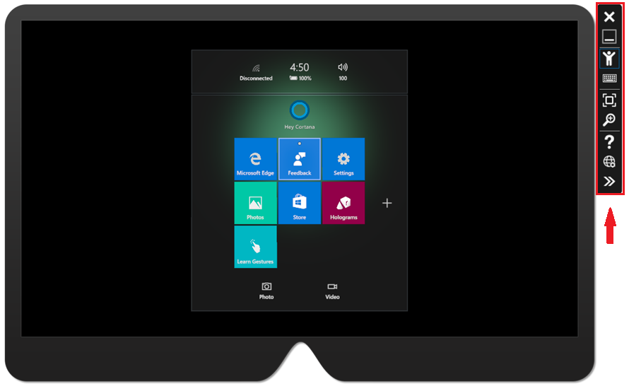 После запуска эмулятора откроется главное окно ОС HoloLens. Справа находится панель инструментов с набором кнопок.