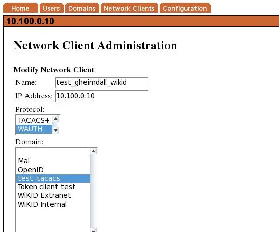 После создания домена откройте вкладку Network Client и нажмите Create New Network Client. Укажите имя клиента и IP‑адрес сервера Gheimdall, выберите протокол wAuth и выберите домен, созданный ранее.