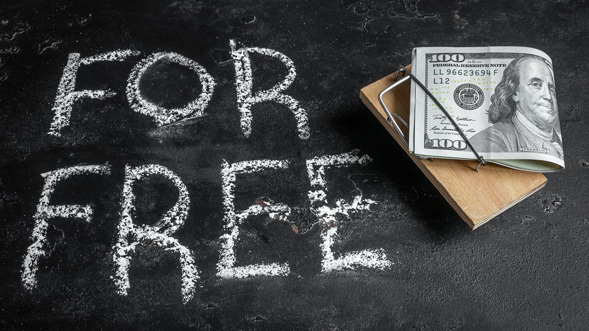 ALT: Иллюстрация бесплатных денег на фоне ловушки — предупреждение о мошенничестве