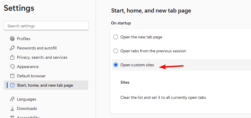 - В блоке When Edge starts (Когда Edge запускается) выберите Open custom sites (Открыть пользовательские сайты).