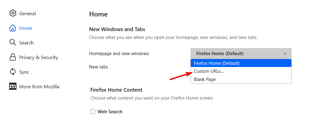 - В разделе Home (Дом) найдите поле Homepage and new windows (Домашняя страница и новые окна).