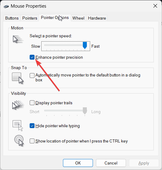 - Отключите «Улучшенную точность указателя» в параметрах мыши.