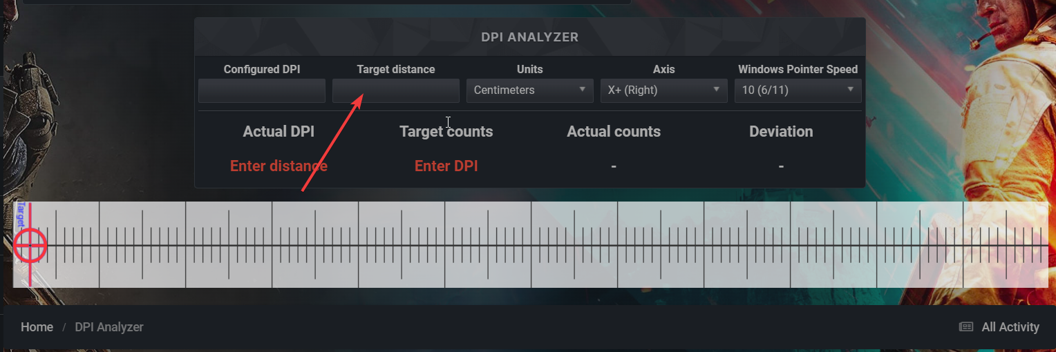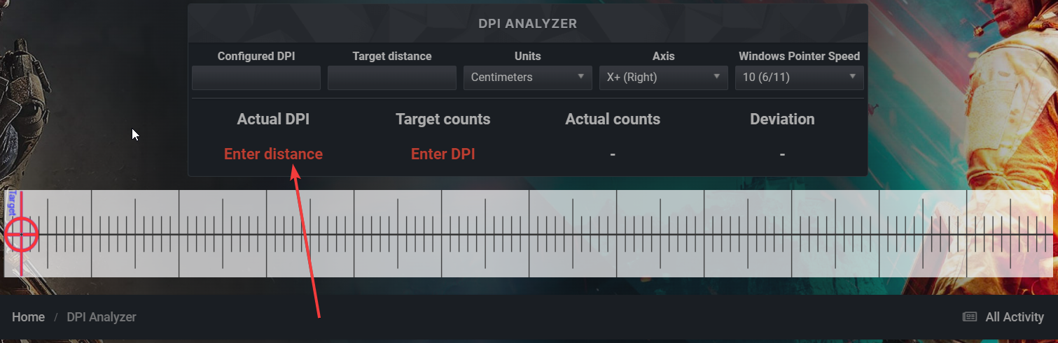 - В поле Target distance укажите расстояние, которое вы планируете пройти мышью по поверхности (в дюймах или см). Оставьте поле Configured DPI пустым.
