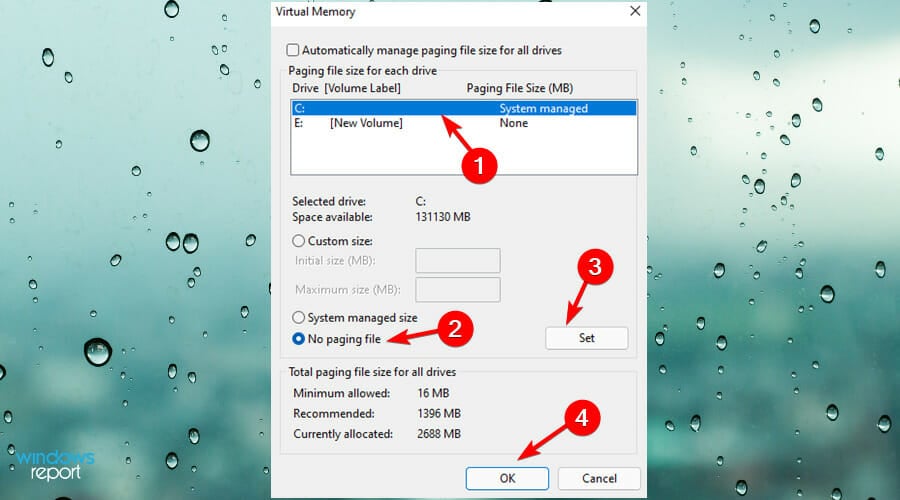 - Выберите диск с игрой и установите Нет файла подкачки → Установить → OK, чтобы выделить подкачку на системном диске.