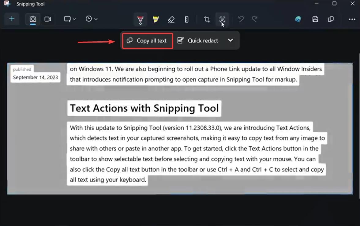 «С этим обновлением Snipping Tool (версия 11.2308.33.0) мы представляем Text Actions, которые обнаруживают текст на захваченных скриншотах, упрощая копирование текста из любого изображения для обмена или вставки в другие приложения.»