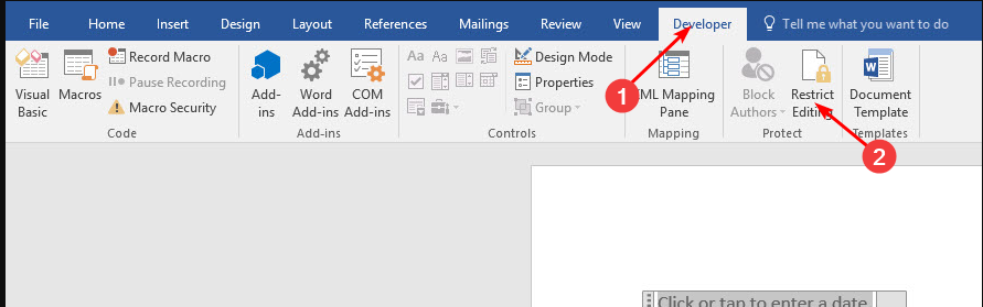 - На вкладке Разработчик нажмите Ограничить редактирование.