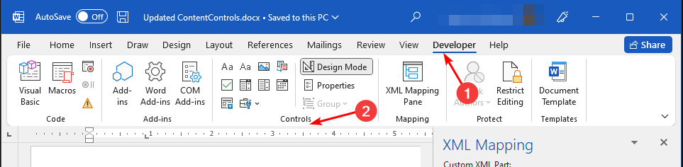 - Режим разработчика — вкладка Word, которая показывает элементы управления формы.