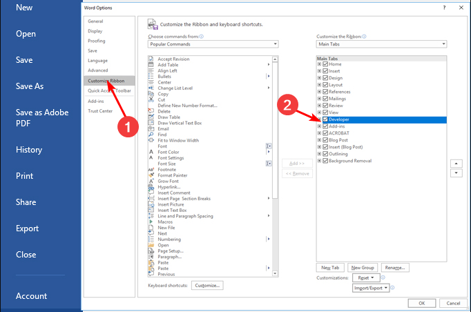 - Перейдите в меню: Файл > Параметры > Настроить ленту.