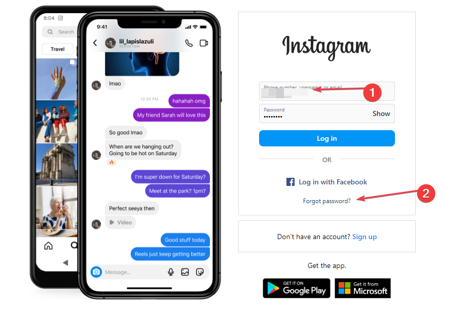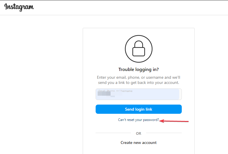 - На странице входа введите имя пользователя, электронную почту или номер телефона и нажмите “Забыли пароль?”.