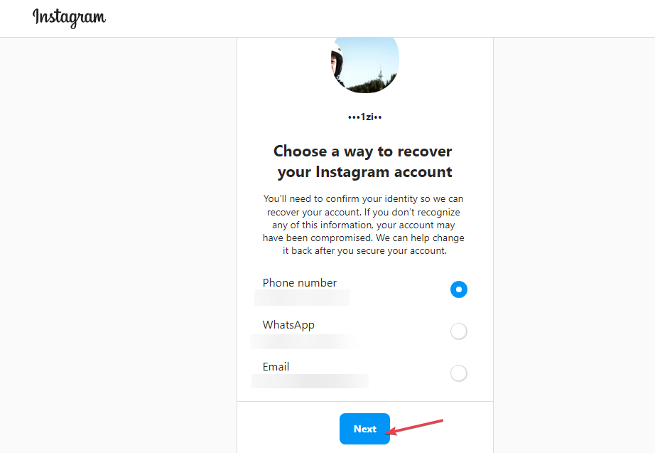 - Если Instagram называет логин, попробуйте “Далее”. Если нет доступа к текущим контактам, нажмите “Нельзя сбросить пароль?”.