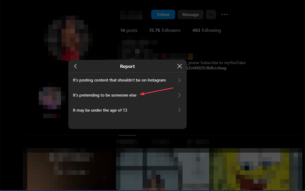 - Выберите причину «Выдаёт себя за другого» и укажите «Я» или «Этот аккаунт взломан» при наличии опций.