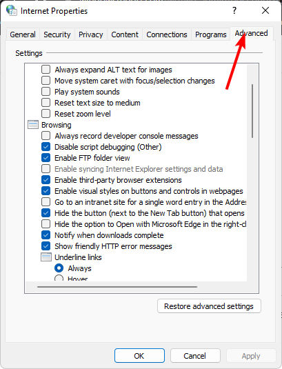 - В окне «Свойства обозревателя» откройте вкладку «Дополнительно».