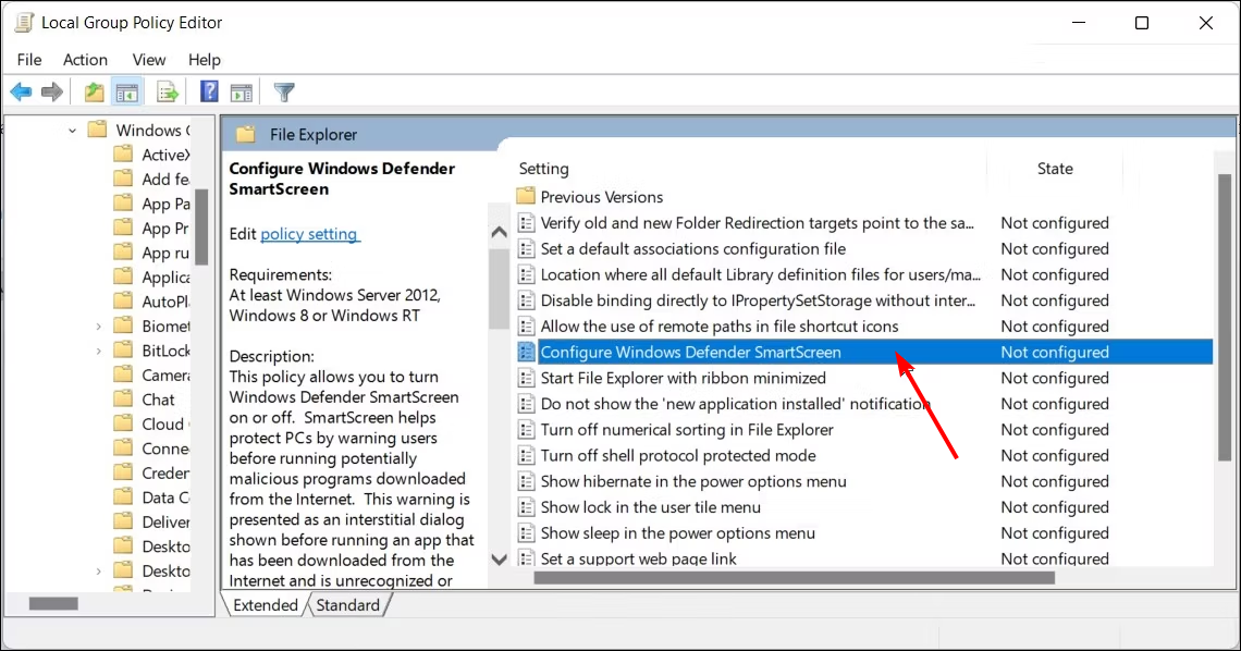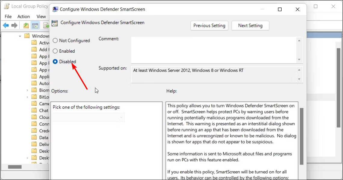 - Group Policy: gpedit.msc → Computer Configuration → Administrative Templates → Windows Components → File Explorer → Configure Windows Defender SmartScreen = Disabled.