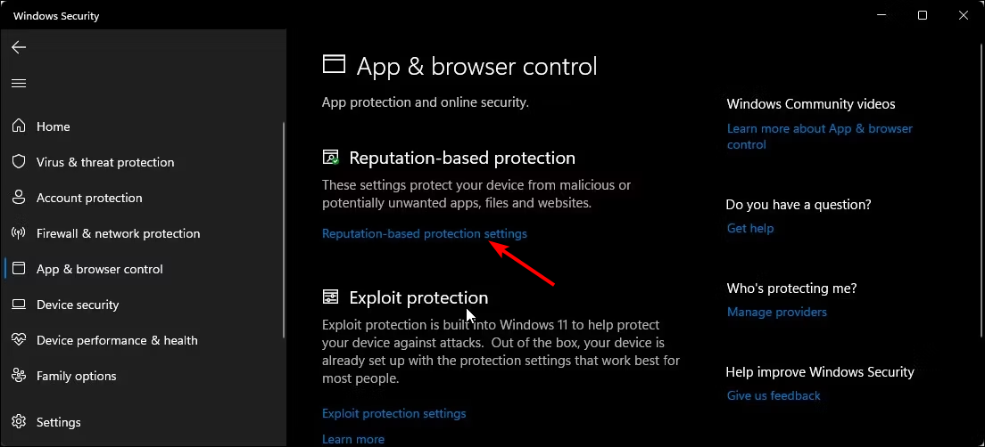 - Выберите «Контроль приложений и браузера», затем нажмите «Параметры на базе репутации» (Reputation-based protection settings).