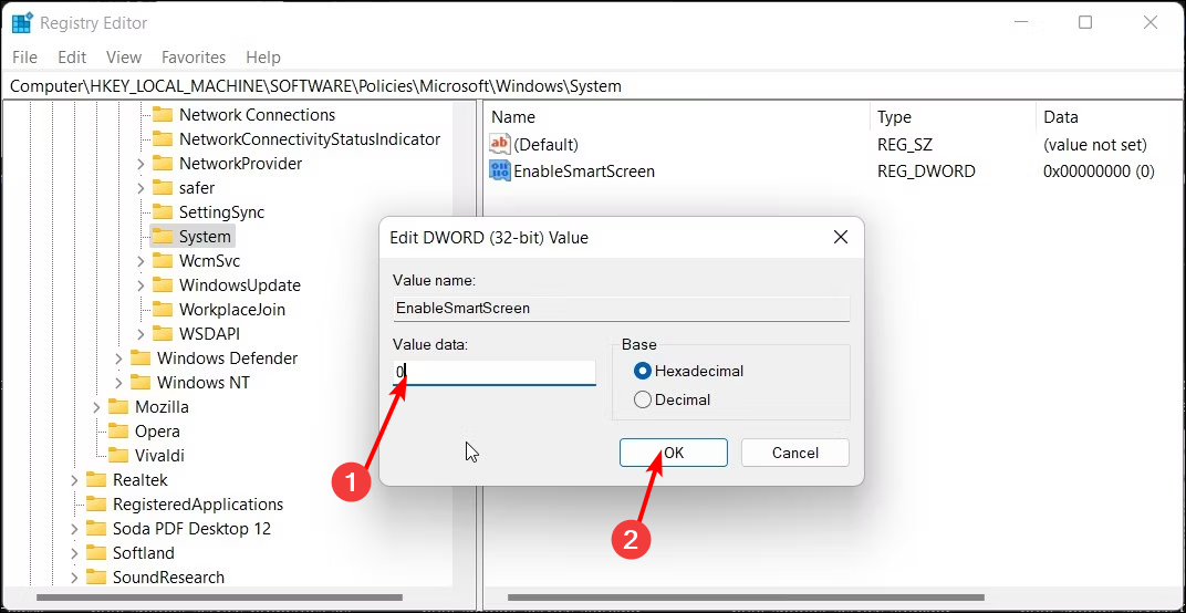 Откройте EnableSmartScreen и в поле «Значение» установите 0, затем OK.