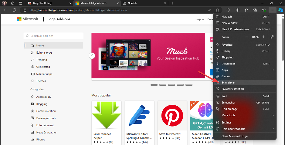 - Откройте Edge, нажмите на вертикальное многоточие (меню) и выберите «Расширения».