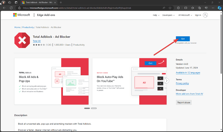 - Введите «Total Adblock» в поле поиска слева и выберите нужный плагин, затем нажмите «Получить» (Get).