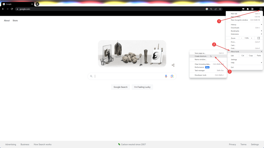 - Если значок установки не появился: откройте меню браузера → Дополнительные инструменты → Создать ярлык и в диалоге отметьте Открывать в окне, затем Создать.
