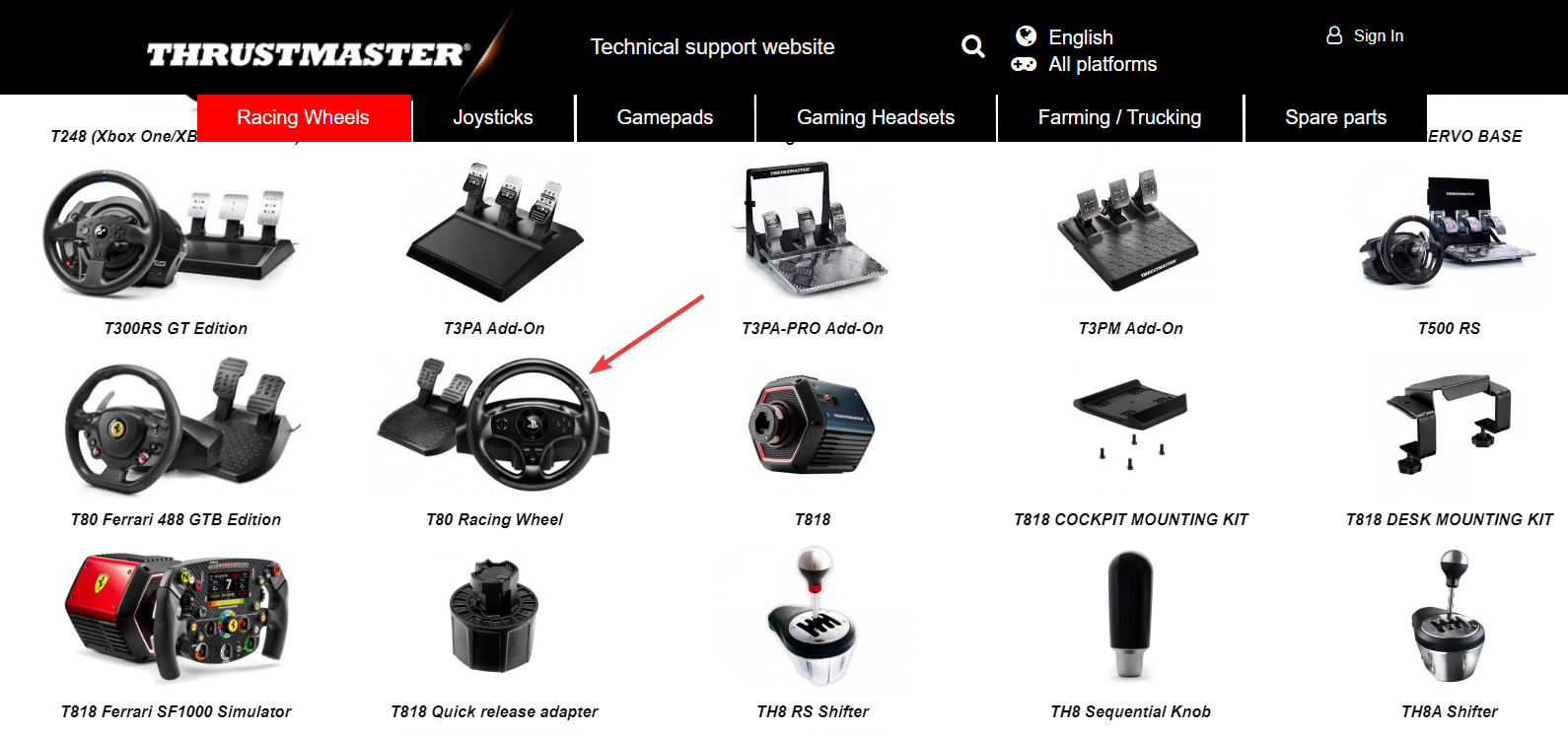 Подпись: страница поддержки конкретной модели рулевого колеса Thrustmaster