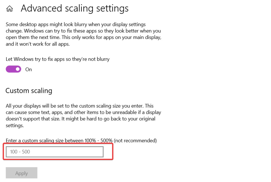 - Нажмите «Дополнительные параметры масштаба» и при необходимости введите значение между 100% и 500% для точной подстройки.