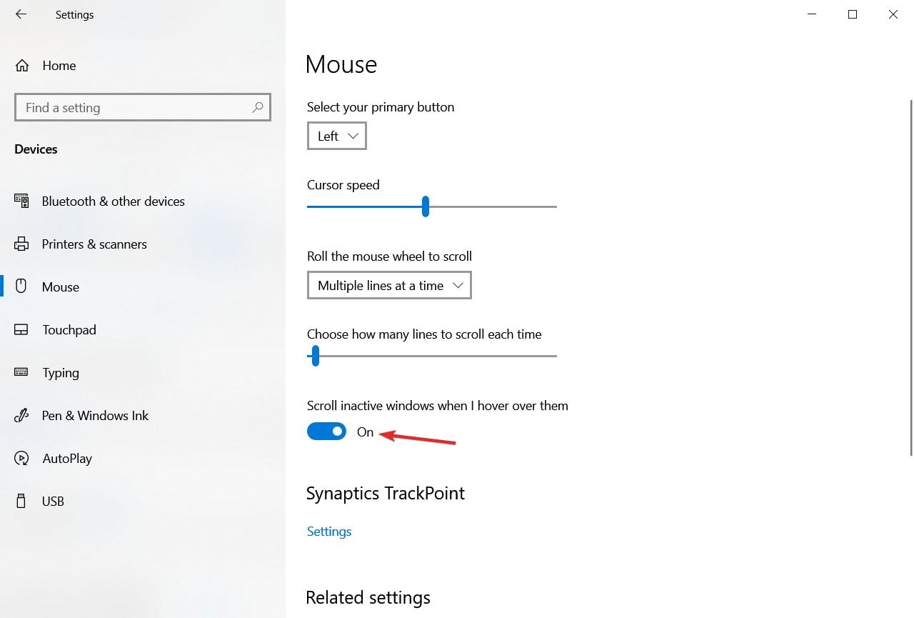 - Найдите опцию Прокручивать неактивные окна и поочерёдно отключите и включите её, проверяя поведение курсора.