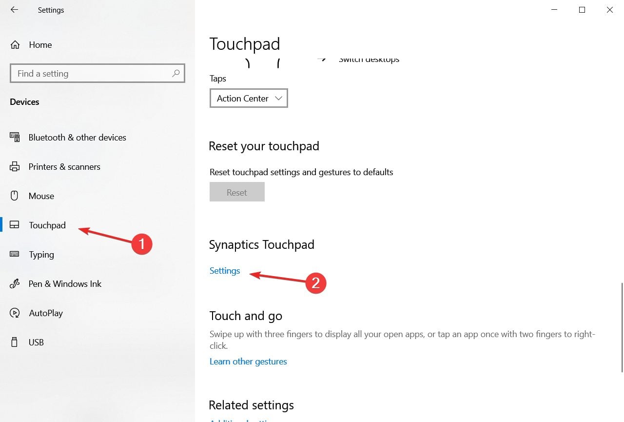 Откройте Тачпад и нажмите Параметры под Synaptics Touchpad.