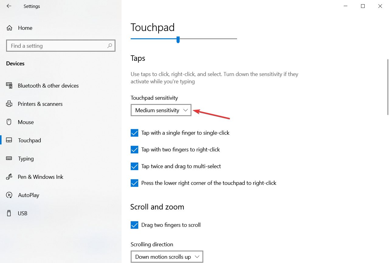 В меню Чувствительность тачпада выберите Высокая чувствительность или Наиболее чувствительный.