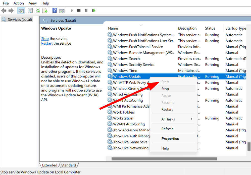 - Найдите Windows Update service, щёлкните правой кнопкой и выберите Stop.