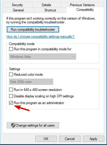 - Вкладка Compatibility → отметить Запускать эту программу от имени администратора.