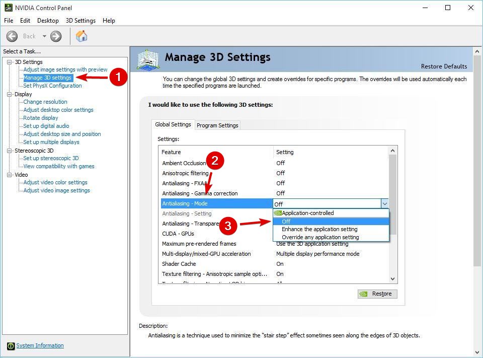 - Откройте NVIDIA Control Panel → Manage 3D Settings.