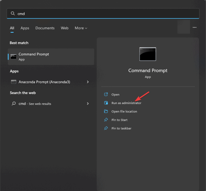 - В безопасном режиме откройте меню Пуск, введите cmd, затем выберите Запуск от имени администратора.