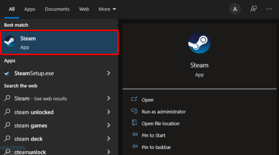 - Нажмите клавишу Windows, введите Steam и откройте приложение.