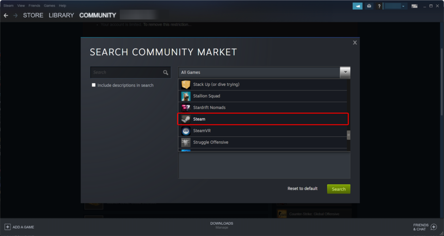- В выпадающем списке All Games выберите Steam.