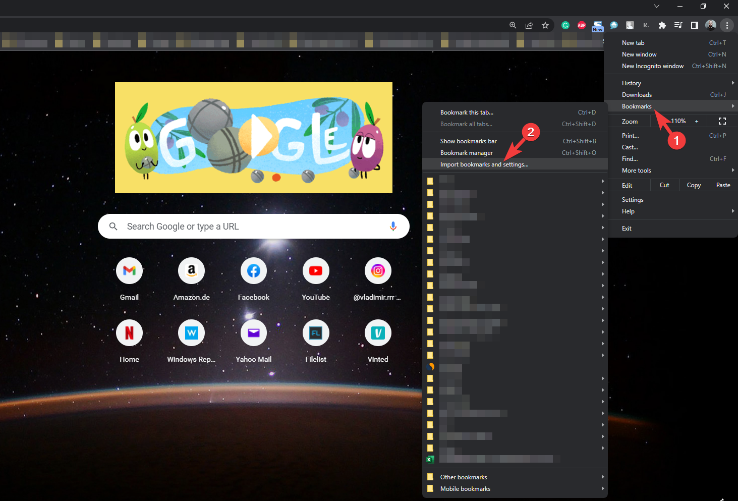 - Откройте Google Chrome и зайдите в Закладки → Импорт закладок и настроек…