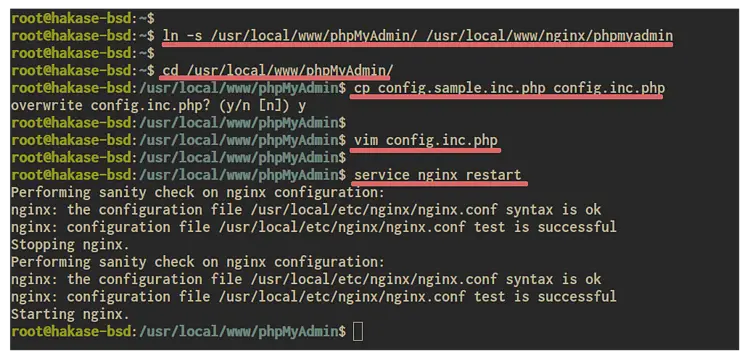 ln -s /usr/local/www/phpMyAdmin/ /usr/local/www/nginx/phpmyadmin- Перейдите в директорию phpMyAdmin и скопируйте пример конфигурации:
