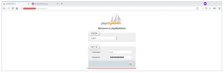 /phpmyadmin страница логина загружается без ошибок. - Вход под администраторской учётной записью MySQL успешен.