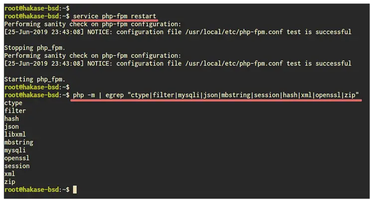 pkg install php73-ctype php73-filter php73-mysqli php73-json php73-mbstring php73-session php73-hash php73-xml php73-openssl php73-bz2 php73-zipПосле установки перезапустите PHP-FPM, чтобы загрузить расширения: