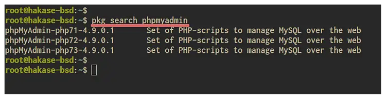 pkg search phpmyadminВы увидите несколько пакетов с разными версиями и привязкой к версиям PHP.