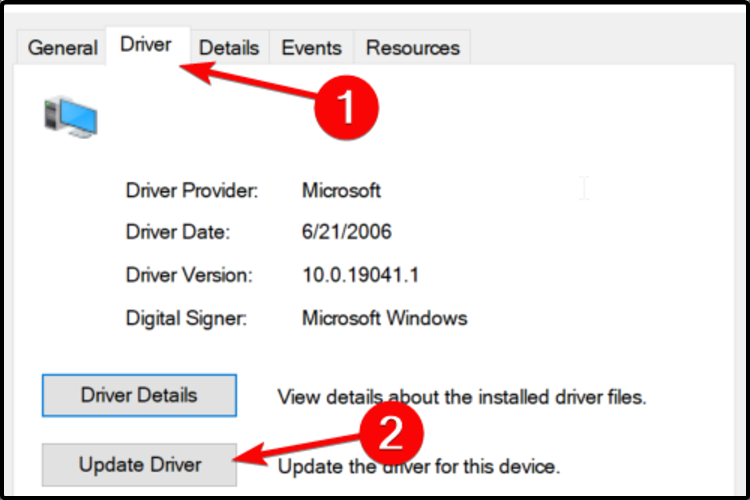 - Перейдите на вкладку Driver и нажмите Update Driver.
