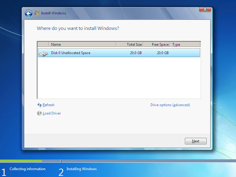 - Выделите целевой раздел и нажмите “Next”. Установка начнёт копировать файлы и разворачивать компоненты. Система может перезагружаться автоматически.