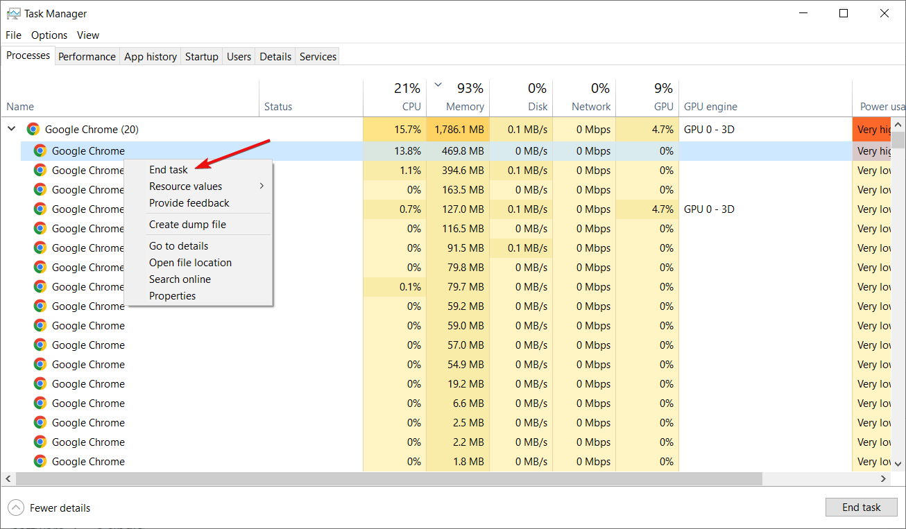 - Правой кнопкой мыши по ресурсоёмкому процессу -> “Завершить задачу”.