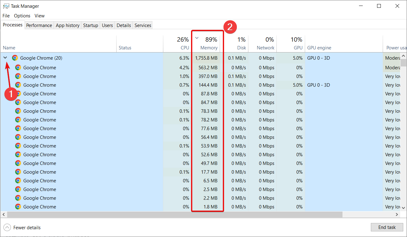 - В списке процессов найдите ветку Google Chrome и разверните её, чтобы увидеть потребление памяти по вкладкам.